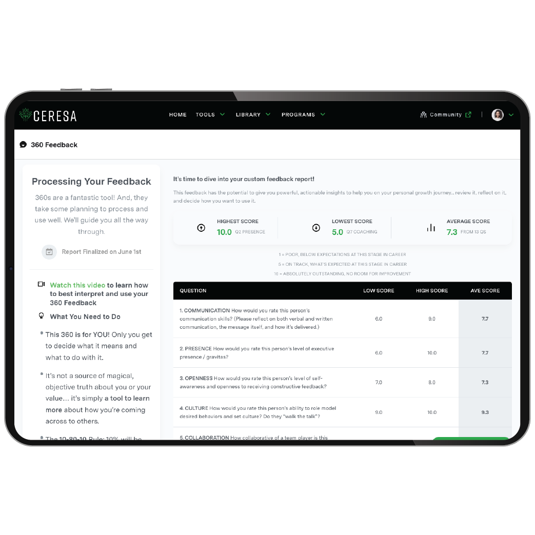 As with all Ceresa coaching tools, only the Participant and their Coach, Mentor, & Matching team will see the results. They will NOT be shared with a manager or employer. It’s 100% focused on delivering actionable feedback to drive growth.